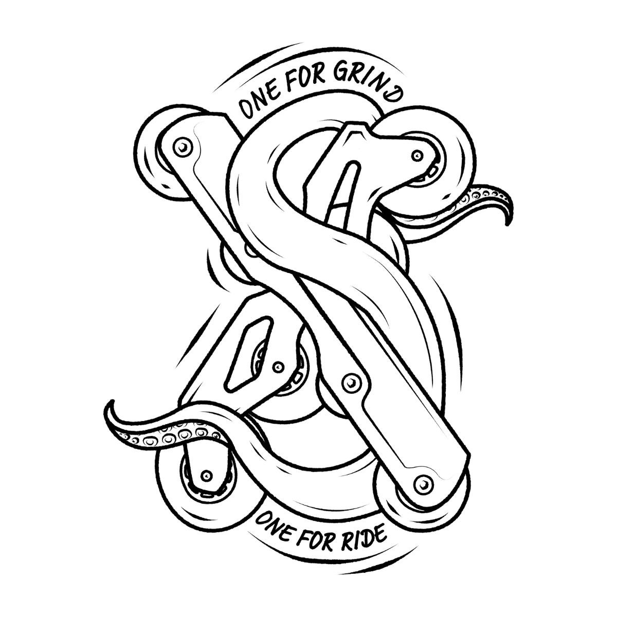 - Nadruk: czarny nadruk z motywem skrzyżowanych szyn do rolek aggressive i free skate oraz napisem „One for grind, One for ride”