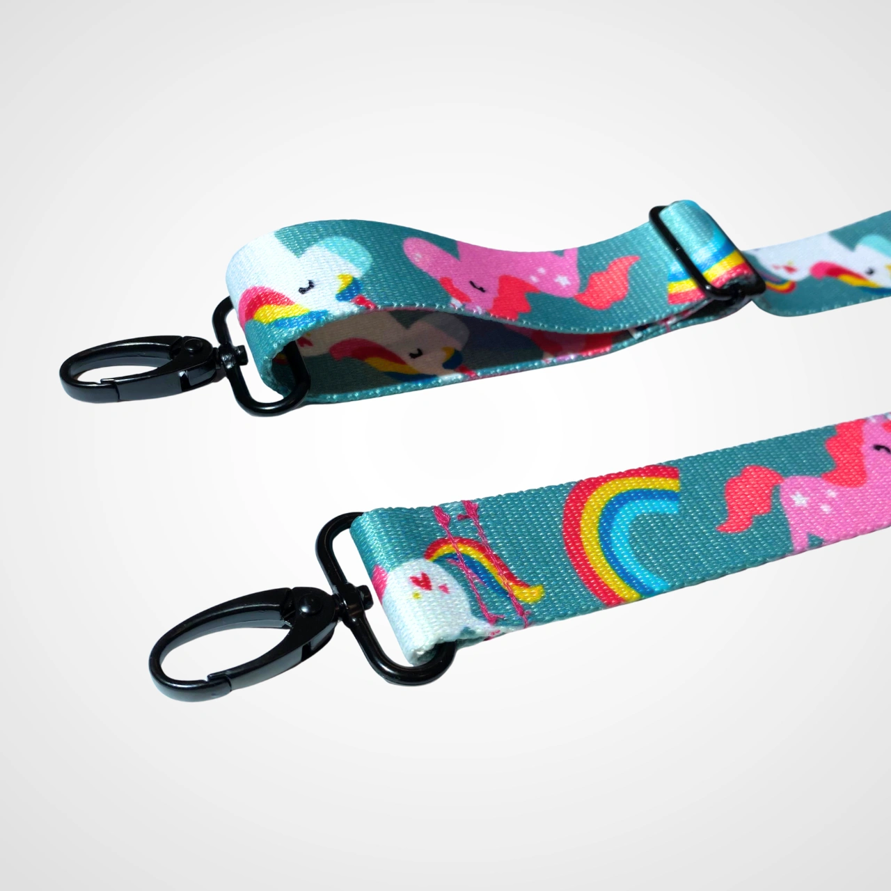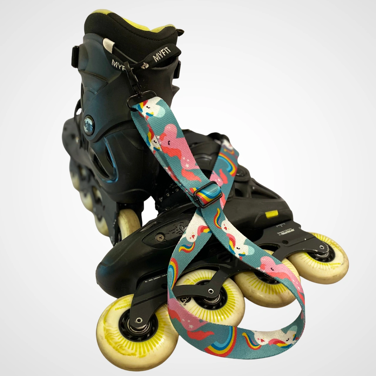 Wykonane z wytrzymałej 30-milimetrowej taśmy poliestrowej, nosidło jest odporne na codzienne użytkowanie i nie straszne mu częste podróże czy intensywne treningi. Regulowana długość ok. 48–88 cm pozwala wygodnie dopasować sposób noszenia — przez ramię, w dłoni, a nawet na plecaku. Całość dopełnia solidny metalowy karabińczyk w czarnym macie, który pewnie trzyma rolki i świetnie komponuje się z kolorowym motywem.